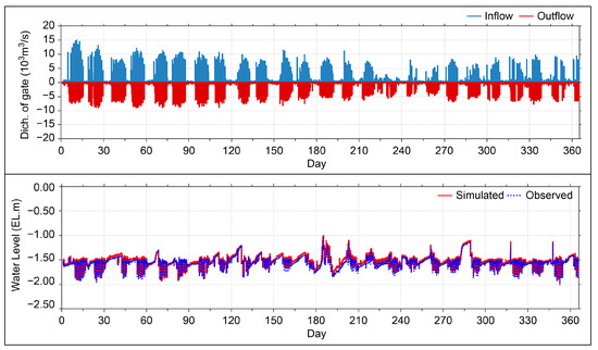 Before running the water quality simulation, the measured and simulated water levels at the drainage gate were compared to check whether the hydraulic simulation was reasonable. The water level simulation yielded an RMSE-observation standard deviation ratio (RSR) of 0.02, a difference of 2.02%, and an AME of 0.188 in the test year 2016. Thus, the model accurately predicted the lake water level. According to the time series simulation results, errors occurred during several periods in 2016, from 11 July to 15 August. This period corresponded with the flood season, and it is thought that these errors were caused by the phenomenon of a large volume of flow in and out of the drainage sluice and the flow gathered in the watershed flowing in simultaneously (Figure 6).