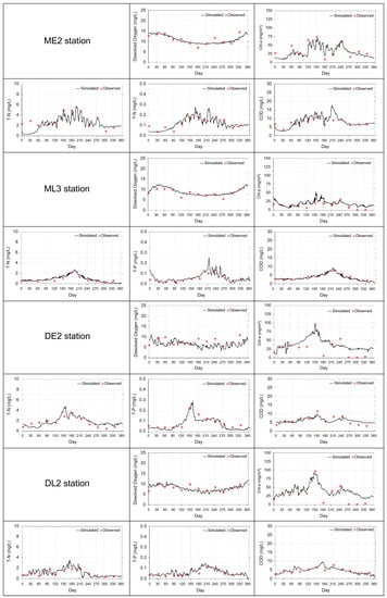 DO exhibited a seasonal pattern of low concentrations in summer and high concentrations in winter. However, the calculation results for the ME2 station did not include its summer concentration values. It appears that the water quality results did not reflect the measured values because the water level of the Saemangeum Reservoir is currently maintained at an elevation of −1.5 m. Hence, the water flow upstream does not always occur, but wet–dry cycles occur repeatedly. In the case of COD, the simulated values reflected the trend of the measured values.