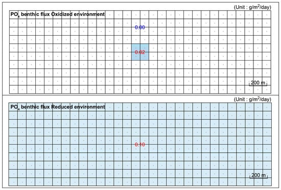 where is the user-defined upper limit of the flux rate and is the flux rate that is finally applied to the calculations. A reasonable value must be entered for the user-defined upper limit of the flux rate () through experiments and a literature review on the release range of the study area. Finally, if the flux rate calculated for each condition () exceeded the user-defined upper limit of the flux rate (), the value predefined by the user was entered. Furthermore, based on the critical concentration in the benthic layer of the water body, it was calculated to be anaerobic if DO < 2 mg/L, and aerobic if DO > 2 mg/L.