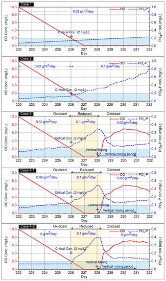 According to the experimental results for Case 1, the DO concentration in the bottom layer decreased linearly. After 227 day, low concentrations were simulated, and the water body changed from aerobic to anaerobic. The PO4-P concentration increased linearly. In addition, the DO concentration in the bottom layer increased in the same pattern, even after reaching a critical concentration of 2 mg/L or less. This was consistent with the conditions of the existing model where a constant value of 0.02 g/m2/day is specified for the flux rate.
