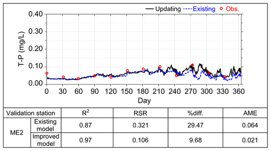 The statistical evaluation function values of the T-P simulation results for the ME2 station upstream of the Saemangeum Reservoir Mangyeong waterway were R2 = 0.87, RSR = 0.321, %diff. = 29.4, and AME = 0.064 for the existing model and R2 = 0.97, RSR = 0.106, %diff. = 9.68, and AME = 0.021 for the improved model. Thus, the reproducibility of the improved model for the simulation of TP concentration at a given station was higher than that of the existing model (Figure 10).