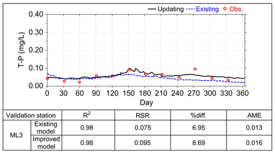 The statistical evaluation function values of the T-P simulation results for the ML3 station downstream of the Saemangeum Reservoir Mangyeong waterway were R2 = 0.98, RSR = 0.075, %diff. = 6.95, and AME = 0.013 for the existing model, and R2 = 0.98, RSR = 0.095, %diff. = 8.69, and AME = 0.016 for the improved model. Thus, the reproducibility of the improved model for the simulation of TP concentration at a given station was lower than that of the existing model (Figure 11).