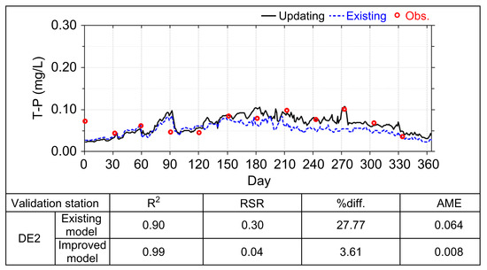 The statistical evaluation function values of the TP simulation results for the DE2 station upstream of the Saemangeum Reservoir Mangyeong waterway were R2 = 0.90, RSR = 0.30, diffusion = 27.77%, and AME = 0.064 for the existing model, and R2 = 0.99, RSR = 0.04, %diff. = 3.61, and AME = 0.008 for the improved model. Thus, the reproducibility of the improved model for the simulation of TP concentration at a given station was higher than that of the existing model (Figure 12).