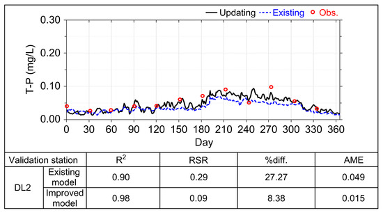 The statistical evaluation function values of the T-P simulation results for the DL2 station downstream of the Dongjin waterway in the Saemangeum Reservoir were R2 = 0.90, RSR = 0.29, %diff. = 27.27, and AME = 0.049 for the existing model and R2 = 0.98, RSR = 0.09, %diff. = 8.381, and AME = 0.015 for the improved model. Thus, it was determined that the reproducibility of the improved model for the simulation of TP concentration was high (Figure 13).