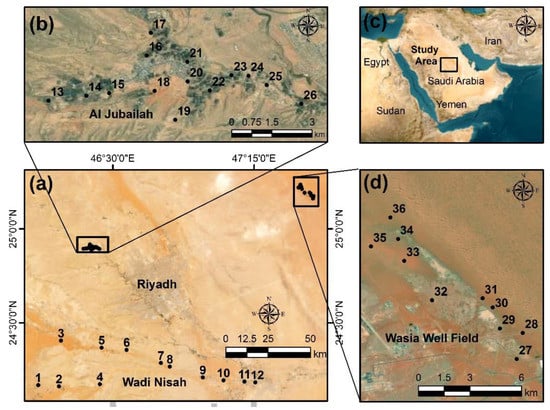 Locations of the groundwater samples in central Saudi Arabia. (a). Wadi Nisah, (b). Al Jubaillah, (c). Location of study in Saudi Arabia, (d). Wasia Well Field.