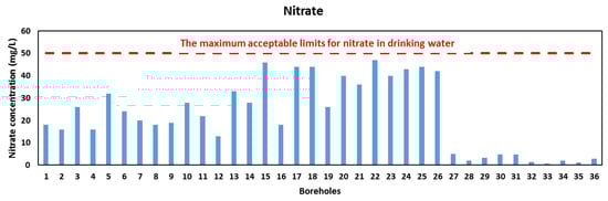 Nitrate is an inorganic ion (NO3−) that naturally occurs in the nitrogen cycle and is widely found in nitrogen-containing fertilizers. Nitrate can enter groundwater through different natural and anthropogenic sources, e.g., rock-water interaction from the weathering of nitrite-bearing rocks, septic tanks, dairy lagoons, wastewater effluents, livestock waste, agricultural land, landfill leachate, fertilizers, pesticides, and manure application [5,6]. High levels of NO3 in water bodies and drinking water create eutrophication, toxic algal blooms, and various diseases, including blue infant disorder (methemoglobinemia), thyroid disorders, teratogenesis, and mutagenesis [2,7,8]. Pregnant women, infants, and young children are most susceptible to the harmful effects of NO3 [9].