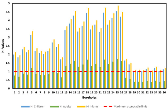 The hazard index (HI) ranged from 0.37 to 1.74 (average of 0.99) for adults, 0.98 to 4.56 (average of 2.59) for children, and 1.05 to 4.87 (average of 2.77) for infants (Table 4, Figure 4). Groundwater samples surpassed the safety level of 1 by 44.44 (16 out of 36), 97.22 (35 out of 36), and 100% for adults, children, and infants, respectively (Figure 4). According to the study’s findings, drinking water in most of the study areas, particularly in water samples from Jubailah (boreholes 13–26) and a few from Wadi Nisah (boreholes 5 and 10), could expose infants, children, and adults to non-cancer health concerns. Additionally, our findings show that infants and children are more vulnerable to non-carcinogenic health risks than adults.