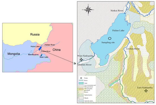Hulun Lake (48°31′–49°20′ N, 116°58′–117°48′ E), which is located in a steppe area in the northeastern part of Inner Mongolia, China (Figure 1), is the fifth largest lake in China []. Although the lake is located in China, about 63.7% of the total basin areas of 256,000 km2 are located in Mongolia. In addition, two rivers (Kherlen River and Urshen River) controlling the main input sources of Hulun Lake both originate from Mongolia []. Most areas of the lake basin are covered by the steppe grassland and are used for grazing []. There were relatively large changes in land use type in the Hulun Lake basin in recent years, which indicated that grassland degradation became increasingly serious []. Recent studies indicated that Hulun Lake suffered from eutrophication, and, sometimes, a cyanobacterial bloom occurs in certain areas of the lake []. Monitoring data gathered from Lake Hulun over the past 20 years (1994–2015) show that the TN (Total Nitrogen) and TP (Total Phosphorus) concentrations ranged from 0.80 to 3.30 mg/L and 0.04 to 0.25 mg/L (Figure 2), respectively; these values greatly exceed the National Grade IV Standards for Surface Water [,].