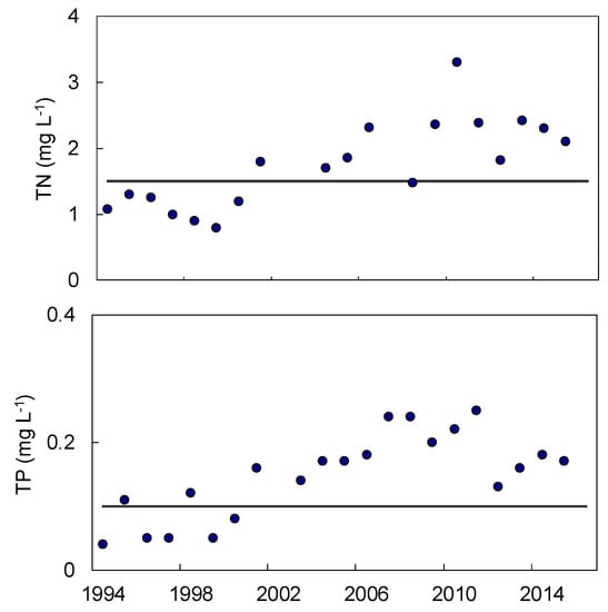 Changes in aqueous TN (Total Nitrogen) and TP (Total Phosphorus) concentrations in Hulun Lake during 1994–2015 (black lines denote limiting values of TN (Total Nitrogen) and TP (Total Phosphorus) of National Grade IV Standards for Surface Water []).