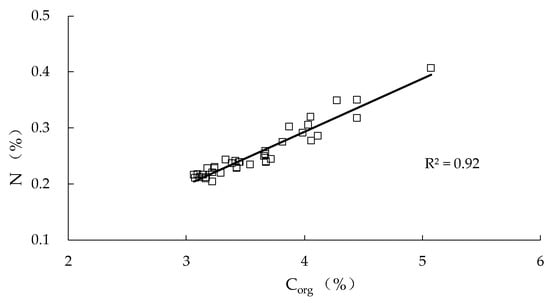 The correlation between Corg% and N% in the sediment core is shown in Figure 4. The changes in Corg% and N% at different depths were extremely consistent and in significant correlation with a correlation coefficient 0.92, indicating that organic carbon and nitrogen in lake sediment cores originated from the same source, while most nitrogen may exist as organic form in sediment.