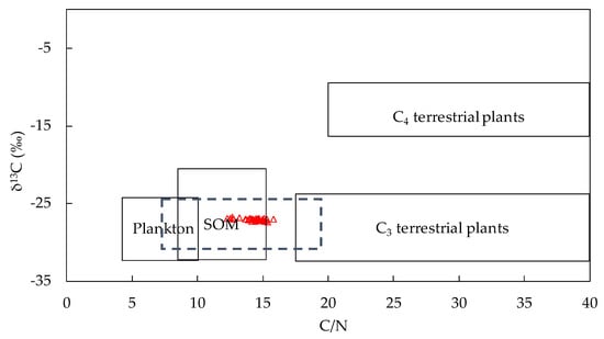 The diagram of the relationship between Corg/N ratios and δ13C values of sediment organic matter was successfully used to distinguish between the different organic matter sources in the sediment, as proposed by Meyers []. In this study, the diagram of the relationship between Corg/N ratios and δ13C values was plotted in Figure 5. Generally, plankton in fresh aquatic have low Corg/N ratios between 4 and 10, whereas vascular land plants with cellulose-rich and protein-poor traits usually have Corg/N ratios of 20 and greater. In contrast, soil organic matter have intermediate Corg/N ratios, ranging from 8 to 15 []. In the lake ecosystem, δ13C is another effective tracer used to identify the autochthonous and allochthonous organic matter sources of sediment. Autochthonous organic matter sources are produced by the biota within aquatic ecosystems, such as aquatic plants (δ13C values range from −20 to −12‰) and plankton (δ13C values range from −32 to −24‰) [], while allochthonous organic matter sources are derived from sources found in areas surrounding the lake, such as C3 terrestrial plants (δ13C values range from −33 and −24‰), C4 terrestrial plants (δ13C values range from −16 to −10‰), and soil organic matter (δ13C values range from −32 to −20‰) [,].