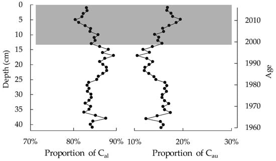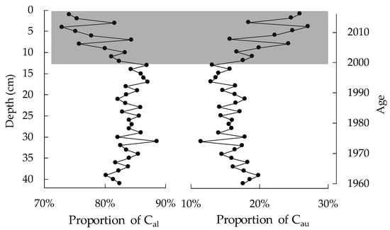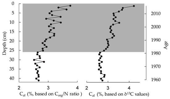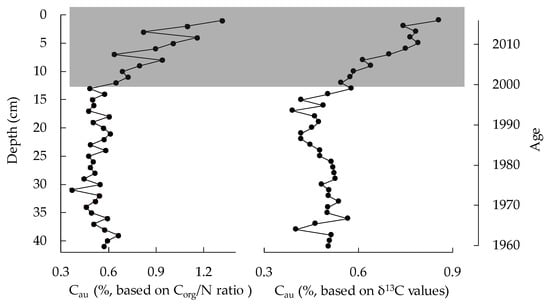 As shown in the vertical profiles of proportions of allochthonous and autochthonous organic carbon based on the binary models of Corg/N and δ13C (Figure 6 and Figure 7), obvious alterations occur in the upper 12 cm (corresponding to the approximate period after the year 2000) of the sediment core. The relative constant proportion of Cau began to increase and reached the maximum, while a continuous increase in proportion of Cal since 2000 was recorded, indicating that the productivity of phytoplankton in the lake increased during this period.