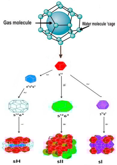 There are three common crystal structures of hydrate, the cubic structure I (sI), cubic structure II (sII), or hexagonal structure H (sH) shown in Figure 1. Structure I is formed with guest molecules having diameters between 4.2 and 6 Å, such as methane.