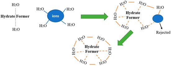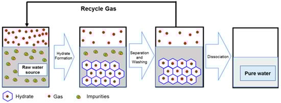 Taking into consideration that the clathrate hydrates are non-stoichiometric compounds formed by a lattice of water molecules hydrogen bonded, they can encage low molecular weight gases or volatile liquids in different cavities if favorable thermodynamic conditions are created [33]. In this solid–liquid separation process, the water molecules create cages around a guest gas/liquid component, thus efficiently separating from a brine solution even at temperatures higher than the normal freezing point of water. These hydrate crystals, after melting become clean water and the gaseous component can be reused [34].