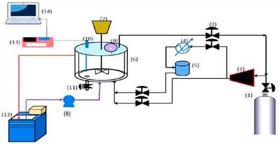 The schematic diagram of the experimental setup for treatment of contaminated water with potassium permanganate and povidone-iodine using clathrate hydrate technique: (1) gas cylinder; (2) needle valve; (3) gas compressor; (4) condenser; (5) accumulator of gas; (6) experimental cell; (7) magnetic stirrer; (8) water pump; (9) digital pressure gauges; (10) temperature sensor; (11) valve drain; (12) chiller; (13) interface system; (14) computer.
