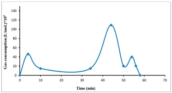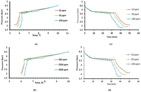 Generally, the effect of adding dyes on the amount of hydrate formed was small (so its effect was slight on the creation of pressure). The optimum concentrations for the user that result in a lower induction time are 100 ppm and 5000 ppm for the potassium permanganate and povidone-iodine, respectively, as shown in Table 1, because this promotor rapidly loses its effectiveness, as described by Dicharry [42,43]. Silica gel powder slightly affected the pressure of the gas hydrate formation, but on the other hand, the gas/water contact was improved and enhanced the conversion of water to hydrate, as water can be dispersed in the pores of silica gels with a very high surface area and pore volume, and then, hydrates can be formed within the pores as described by Lee and Seo [44]. Since the average pore diameter was greater than 100 nanometers (in this study, 120 nm), that led to increased hydrate formation because of increased diffusion in the larger pores, as described by Kang et al. [45].