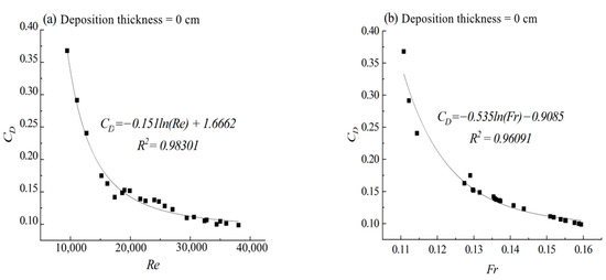 | 11.5 | CD = −0.478ln(Re) + 5.14 | 0.99 | CD = −0.875ln(Fr) − 1.25 | 0.99 |