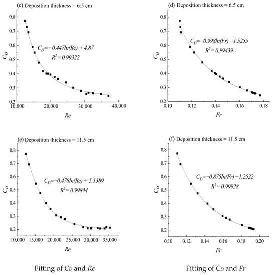 | 6.5 | CD = −0.447ln(Re) + 4.87 | 0.99 | CD = −0.998ln(Fr) − 1.53 | 0.99 |