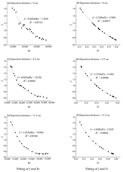 | 11.5 | f = −1.012ln(Re) + 10.96 | 0.99 | f = −1.838ln(Fr) − 2.54 | 0.99 |