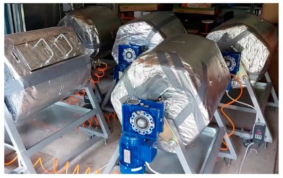 After determining the appropriate weight proportions and then mixing, the substrates were placed in rotating bioreactors (Figure 1) with a volume of 150 L. Rotation speed was 5 rpm. The bioreactors were thermally insulated and equipped with an aeration system.