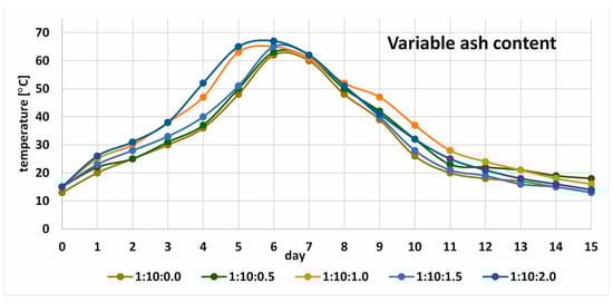 Figure 2. Composting of stabilized sludge with straw and a variable amount of ash from sewage sludge combustion at constant density (520 kg/m3) and amount of air supplied (5.0 L/(h∙kg d.m.))—average of three replications.