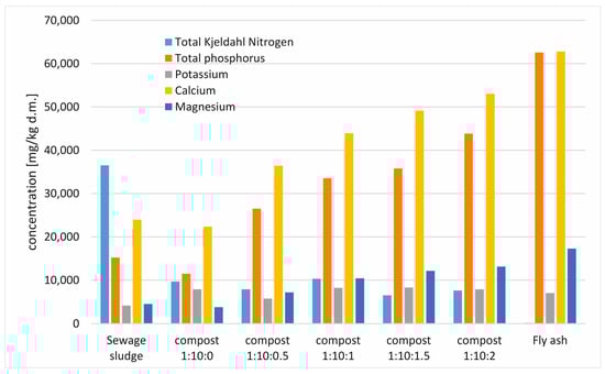 The content of total phosphorus in the obtained composts is in most cases higher than the content in sewage sludge. This is due to the high content of phosphorus in the fly ash. In the case of declaring phosphorus in the compost, for all composts obtained, we obtain phosphorus values above the minimum value (0.2% m/m—weight of the component converted to phosphorus pentoxide P2O5 to the weight of the mixture) specified in the Regulation of the Minister of Agriculture and Rural Development on the Implementation of Certain Provisions of the Act on Fertilizers and Fertilization [55].