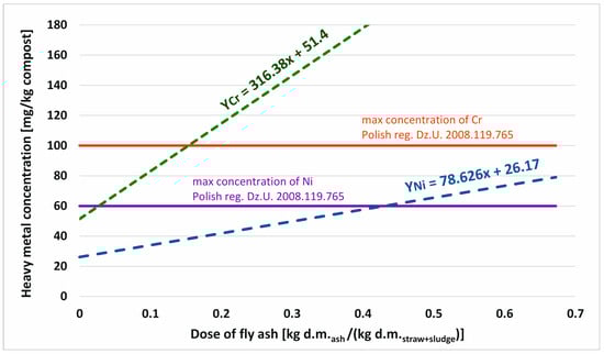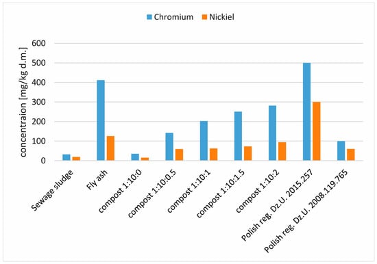 Comparing the concentrations of heavy metals in the obtained composts to the limit values given in the Regulation of the Minister of Agriculture and Rural Development on the Implementation of Certain Provisions of the Act on Fertilizers and Fertilization [55], there are noticeable exceedances for two metals, i.e., chromium and nickel. In the light of the applicable regulations, it can be concluded that the concentration of these two metals in the fly ash is a factor limiting the amount of fly ash that can be added to the compost mass. Figure 5 shows the concentration of chromium and nickel in the substrates and samples of the resulting compost.