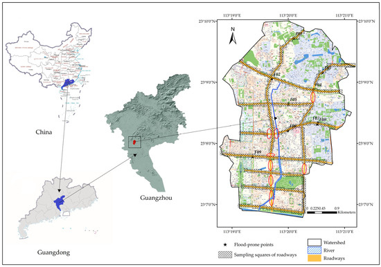 The data on the distribution of flood risk points were obtained from the flood risk point data released by the Guangzhou Municipal Emergency Management Bureau in May 2022 [68]. The Guangzhou Water Affairs Bureau has provided roadway elevation data, measured flood process data for flood-prone points, and precipitation data. There exist nine historical flood-prone points within the study area. These points are identified by their corresponding numbers, namely F01, F02, F03, F04, F05, F06, F07, F08, and F09, as can be seen in Figure 1.