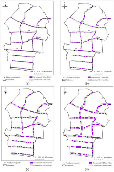 A spatial superimposition analysis of the distribution of flood-prone spots and the terrain parameters was conducted to investigate the relationship between the two. As shown in Figure 2, the total number of historical flood-prone points in the study area is nine. Under the four scales of 27 m × 27 m, 54 m × 54 m, 81 m × 81 m, and 108 m × 108 m, the number of flood-prone points that coincide with the quadrats with curvature < 0 in the terrain parameters are 6, 9, 8, and 8, respectively. The spatial coincidence rate can reach a maximum of 100%, indicating a strong spatial correspondence between the distribution of urban flood-prone points and the micro-topographic pattern. The sampling grid size also influences the research findings: when the sampling scale is 54 m × 54 m, the coincidence ratio between flood-prone points and terrain depression parameters is higher, and when it is larger or smaller than this scale, the degree of coincidence decreases. The road width in the study area is generally between 10 and 60 m, and it seems that the closer the side length of the sampling grid is to the road width, the more realistic the calculated terrain parameters are.