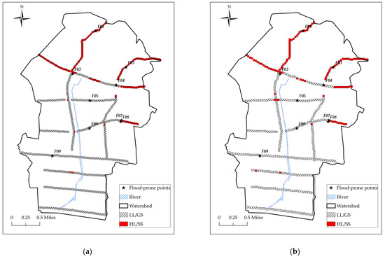 The study area was divided into two terrain types: LL/GS and HL/SS. Analysis of variance (ANOVA) revealed significant variations in elevation and slope between these terrain types, indicating distinct terrain characteristics. However, no significant differences were observed in curvature parameters, suggesting that the distribution of surface depressions (curvature < 0) on urban roads is not influenced by elevation or slope changes. These depressions appeared to be randomly distributed throughout the road network. The ratio of NFPS/TNS showed minor differences between the two terrain types, indicating that the distribution of flood-prone points is not significantly influenced by elevation or slope. The study area represents a small-scale catchment where flood-prone points are concentrated within a relatively small area, suggesting similar rainfall conditions. After eliminating the influence of rainfall conditions and terrain factors, the significant differences observed in the correlation analysis between different terrain categories can be solely attributed to variations in the efficiency and functionality of the drainage systems. In previous pipe network designs, the economic cost is a crucial consideration, and the desired slope of drainage pipelines is typically designed to closely match the natural slope of the surface [75,76]. In the LL/GS areas, which have a low surface elevation and gentle overall slope, the slope at the base of the drainage pipeline is likely to be relatively gradual. Additionally, as shown in Figure 3, this area is closer to the city’s natural water system and represents the downstream region, occasionally affected by outlet water pressure. Additionally, it experiences higher overall drainage pressure compared to the HL/SS areas. Thus, it can be inferred that the impact of terrain on the distribution of flood-prone points is limited by the performance of the drainage system. This finding aligns with previous studies by Komori et al. [77] and Rahmati et al. [78], suggesting that while terrain characteristics significantly influence the formation of urban flood-prone points, they are not the sole determining factor. Human-made factors, such as the drainage system’s performance, are considered more critical.