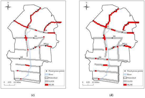 Spatial correspondence between the surface depression and the flood-prone points at different scales. (a) 27 m × 27 m; (b) 54 m × 54 m; (c) 81 m × 81 m; (d) 108 m × 108 m.