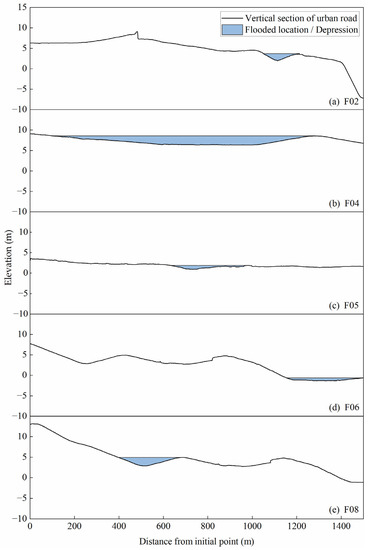 Vertical section of the local depressions where the flood-prone points are located. (a) Flood-prone point “F02”; (b) Flood-prone point “F04”; (c) Flood-prone point “F05”; (d) Flood-prone point “F06”; (e) Flood-prone point “F08”.