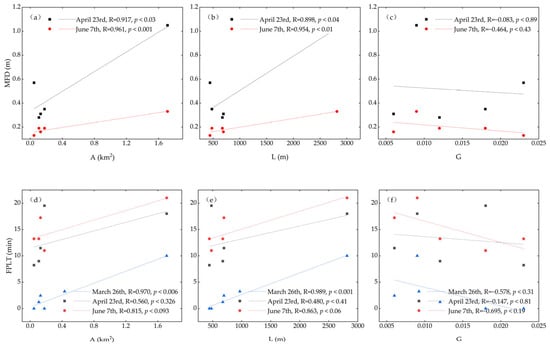 Correlation between flood characteristic parameters (MFD and flood peak lag time(FPLT)) and terrain parameters of the catchment (catchment area (A), flow path length (L), and flow path gradient (G),). (a) Correlation between the MFD and A. (b) Correlation between the MFD and L. (c) Correlation between the MFD and G. (d) Correlation between the FPLT and A. (e) Correlation between the FPLT and L. (f) Correlation between the FPLT and G.
