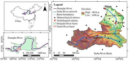 The Taohe River is a first-level tributary on the right bank of the upper Yellow River. Originating from Xiqingshan, Qinghai Province, it flows into the Liujiaxia Reservoir in the upper main stream of the Yellow River, with a total length of 673 km and a watershed area of 25,527 km2. Its geographical location is 101°36’~104°20’ E, 34°06’~36°01’ N (Figure 1). The upper reaches are above the Xiabagou hydrological station, the middle reaches extend from the Xiabagou hydrological station to Lijiacun hydrological station, and the lower reaches are below the Lijiacun hydrological station to Hekou hydrological station. The multiyear average annual temperature increases from 1 °C in the upper reaches to 9 °C in the lower reaches, while the multiyear average annual precipitation decreases from 650 to 300 mm [29]. The upper and middle reaches are cold and humid, while the lower reaches are warm and arid [28]. The basin contains abundant water resources with large amounts of runoff in the Gansu section of the Yellow River basin. The land spans three major geomorphic units: the plateau region in the upper reaches, the alpine valley region in the middle reaches, and the loess hilly–gully region in the lower reaches. The upper and middle reaches are 2000 m above sea level and have good vegetation coverage, while the lower reaches have low elevation, poor vegetation coverage, and severe soil and water erosion. The water and sand are from different sources, with water originating from the upper reaches and sand from the lower reaches [30].