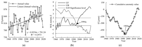 ET0 was calculated for each station based on meteorological data during 1960–2019 from 19 meteorological stations in and around the Taohe River basin. Site ET0 was weighted based on the Thiessen polygon to obtain the basin ET0 [48]. The interannual variation in the basin ET0 is shown in Figure 2a. The time series of ET0 showed a significant upward trend over 60 years, with a linear change rate of 0.93 mm/a, and the Mann–Kendall (M-K) statistic Z was 4.31, reaching a significance level of 0.05. The annual mean value of ET0 was 819.46 mm, and the coefficient of variation was 3.59%. The maximum value during 1960–2019 was 884.52 mm in 2016, the minimum value during 1960–2019 was 760.15 mm in 1989, and the extreme value ratio was 1.16. The M-K test is shown in Figure 2b. The ET0 time series jumped in 1994, which is consistent with the cumulative anomaly curve shown in Figure 2c. ET0 decreased from 1960 to 1993 and increased from 1994 to 2019, when the mean value of ET0 increased from 803.39 to 840.49 mm, with an increase of 4.62%. The ET0 time series reached a significance level of 0.05 in 2000 and showed a significant increase.