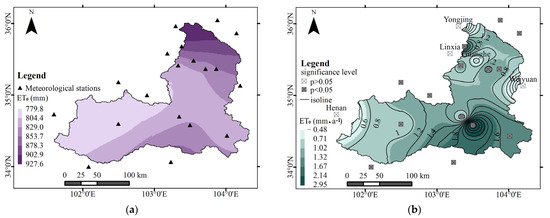 Spatial distribution of annual value and linear change rate in ET0 in the Taohe River basin: (a) spatial distribution of annual ET0; (b) spatial distribution of linear change rate in ET0.