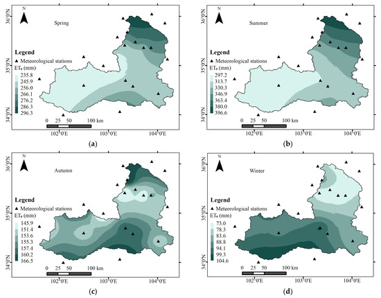 Spatial distribution of ET0 annual value in four seasons in the Taohe River basin: (a) spring; (b) summer; (c) autumn; (d) winter.