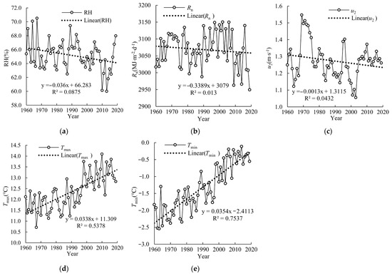 Interannual variation in meteorological variables: (a) RH; (b) Rn; (c) u2; (d) Tmax; (e) Tmin.