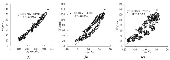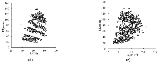 The regression curves between ET0 and Rn, u2, Tmax, Tmin, and RH are shown in Figure 6. In Figure 6, linear regression was used to reveal the correlation between ET0 and the meteorological variables. The more the data points are concentrated on a particular line and the closer R2 is to 1.0, the stronger the correlations between ET0 and the meteorological variables. ET0 is closely related to Rn, Tmax, and Tmin. The linear regression of ET0 and Rn is the most significant, and the determination coefficient R2 is 0.978 (Figure 6a). Second, the determination coefficients R2 between ET0 and Tmax and Tmin are 0.876 (Figure 6b) and 0.795 (Figure 6c), respectively. There is no obvious regression relationship between ET0 and RH or u2. The regression relationship between ET0 and various meteorological variables is consistent with the results of the correlation coefficient and grey correlation degree noted in Section 3.3.1, which shows that ET0 has a close statistical correlation with the time series for Rn, Tmax, and Tmin, and poor consistency with the time series for RH and u2.