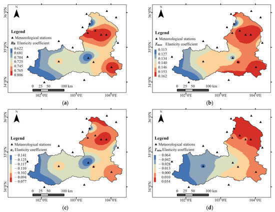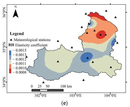 Spatial distribution of elasticity coefficients for meteorological variables in the Taohe River basin: (a) Rn; (b) Tmax; (c) u2; (d) Tmin; (e) RH.