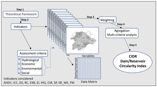 The creation/definition of this novel and quantitative index for the Dam/Reservoir Circularity, denoted as CIDR, is defined as a methodological process in five steps.