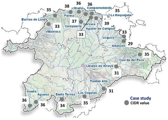 There are 4 dams/reservoirs (22.22%) that present a value within the percentile 25 and less than the median (Cervera, Úzquiza, Villameca, Santa Teresa dams/reservoirs). The other 4 dams/reservoirs have a CIDR value equal to the median with a value of 35, which is the case of Castro de las Cogotas, Cuerda del Pozo, La Requejada, and Barrios de Luna.