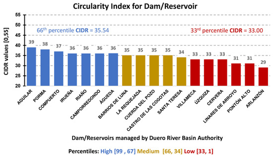 Empirically, for this research, the CIDR revealed that seven dams/reservoirs present a high water circularity, and seven of them are low. The results for the CIDR are very high, above the 66th percentile in seven dams/reservoirs. The values for CIDR are equal to or above the 75th percentile in seven dams/reservoirs and they have been classified as CIDR high.