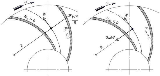 where W represents the fluid speed in the relative frame, y is the distance in the normal direction to the flow trajectories, and R is the radius of curvature of the relative fluid trajectories, i.e., the curvature of the interblade channel. The Richardson numbers govern the flow within the boundary layer near the surfaces of the blade-to-blade and meridian channels. While the Richardson number represents the local ratio between the mean value of the Coriolis forces and the inertial force of the relative flow, the Richardson number represents the local ratio between the centrifugal force induced by the channel curvature radius R and the inertial force of the relative flow. The parameters and , defined by Bajle, allow the quantification of the stability of the flow, i.e., the possible onset of secondary flows under the influence of the impeller angular velocity ω and the channel curvature radius R. Specifically, the fluid flow will manifest a stable behavior for values of and above 0.