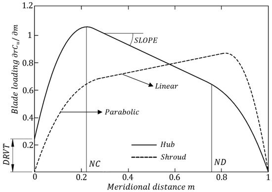 Zangeneh et al. [16,20,50] suggested a flexible distribution of the meridional derivative , which is generally specified along the hub and shroud streamlines (Figure 4). For each streamline, the distribution is represented by three segments and four parameters: the connection point locations NC and ND, the slope of the linear line SLOPE, and the loading at the leading edge DRVT. These are used to control the distribution curve.