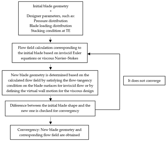 However, it is important to emphasize how the IDM is based on different approaches to the flow field calculation. Specifically, the IDM can be classified into four different categories: the “inviscid” category, as described in the references by Pàscoa et al. [42] and also by Zangeneh et al. [43]; the “viscous” category [30,44,45]; the “compressible” category, analyzed in particular by Zangeneh et al. [16]; and the “incompressible” category, studied in the initial phase by researchers such as Hawthorne et al., Tan et al., and Borges [12,13,14,15,19].