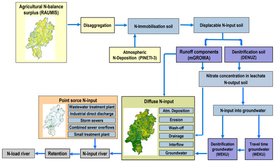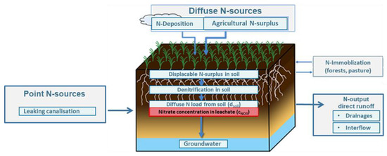 Determination of diffuse N outputs from soils and the nitrate concentration in the leachate is simulated with the reactive N transport model DENUZ [49]. DENUZ considers agricultural N balance surpluses and the atmospheric N deposition as diffuse nitrogen sources (Figure 3).