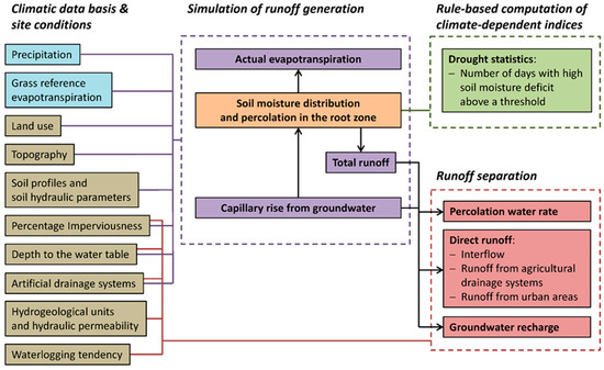 In the second step, the separation of the leachate into groundwater recharge, and the direct runoff components urban direct runoff, interflow and drainage runoff were carried out in monthly time steps. For this purpose, the site characteristics relevant for the separation of the leachate were identified and parameterized. In areas with unconsolidated rock, the installation depth of agricultural drainage systems [38,52] and the seasonally fluctuating groundwater tables control the separation of the leachate into drainage runoff and groundwater recharge. This means that drainage runoff is formed exclusively when the groundwater table has risen above the installation depth of the drainage systems.
