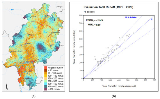 Modeled total runoff (a); comparison with observed runoff at 78 gauging stations (b).