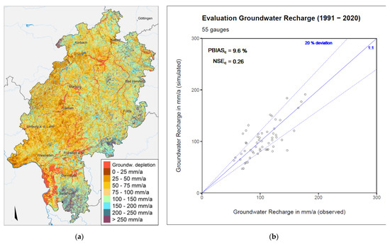 The possibility of validating the modeled direct runoff rates at the state level is limited by the lack of official monitoring networks for the long-term recording of direct runoff components, such as the drainage runoff. The only runoff component for which plausibility checks are usually performed is the groundwater recharge. For areas in Germany where unconsolidated rocks dominate, the mean groundwater runoff is often approximated by the minimum monthly low flow (MoMNQ) [103]. For Hesse, this applies to only one gauging station. All other Hessian catchments are dominated by consolidated rocks, for which the method proposed by Demuth in [104] is suitable for runoff separation. It uses a permanent curve to determine the mean baseflow, yielding either an S-shaped curve type with a linear range, or a parabolic curve type. Since the Demuth method did not provide reasonable results for 23 Hessian catchments with a parabolic curve type, these results were not used for the evaluation. Figure 5 shows the groundwater recharge rates modeled with the mGROWA model (left) and the agreement with the observed baseflow at the remaining 55 river gauges (right).